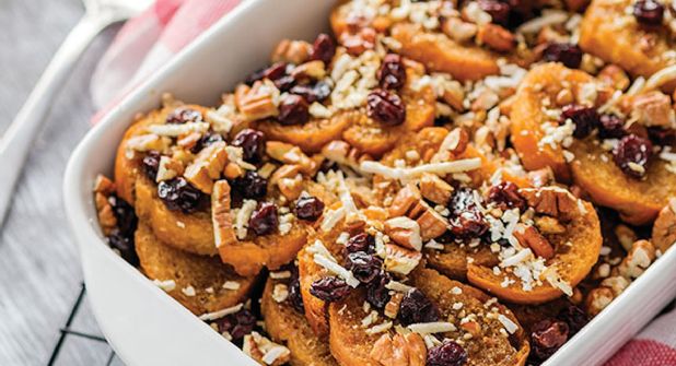 Capirotada, pasas y maníCapirotada, encarameladas5. Cubre esta primera capa de pan con queso, pasitas, cacahuates y cualquier otra fruta o nueces que hayas decidido agregar. - Coloca otra capa de pan y continúa con el mismo proceso que en el paso anterior.