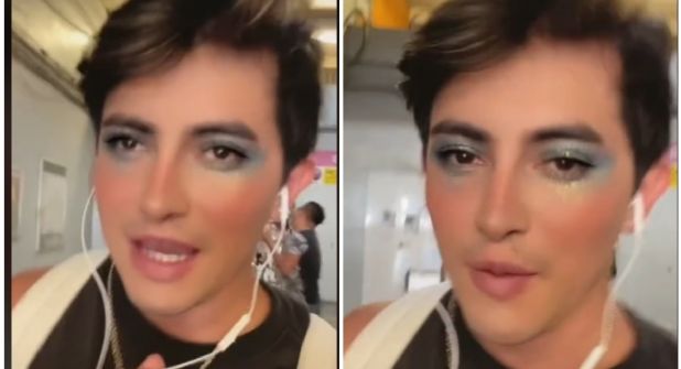 Ya que en la grabación, se muestra como el joven trae maquillaje, sombra de color azul alrededor de los ojos y algunas partículas de glitter, también rubor en las mejillas y los labios pintados.
