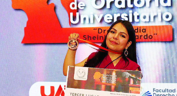 Cynthia Nayeli Arriaga Vázquez, estudiante de Derecho en la Facultad de Comercio, Administración y Ciencias Sociales de la UAT de Nuevo Laredo, obtuvo el tercer lugar en el Concurso Nacional de Oratoria Universitario “Doctora Claudia Sheinbaum Pardo”, gracias a su talento y habilidad en el arte de la palabra hablada.
