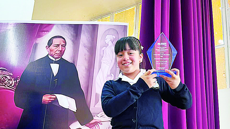 Alexa Naomi Araujo Rocha, alumna de la Escuela Primaria Arquímides Caballero Caballero, se alzó con el trofeo del primer lugar del XXVIII concurso de oratoria “Sentimiento Juarista”, en su etapa de sector.