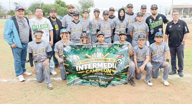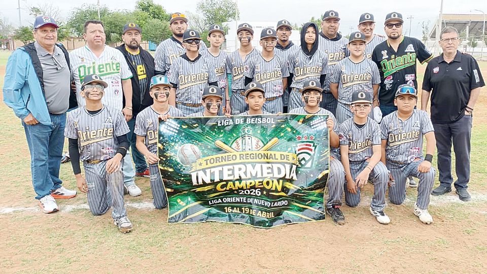 La Liga Oriente de Nuevo Laredo se consagró campeón invicto en el Torneo Regional de Intermedia 2026, al vencer 8-3 a la Liga de Beisbol Santa María de Aguayo el sábado en duelo celebrado en el Parque Lincoln de la Unidad Deportiva Benito Juárez.
