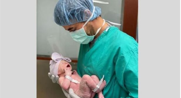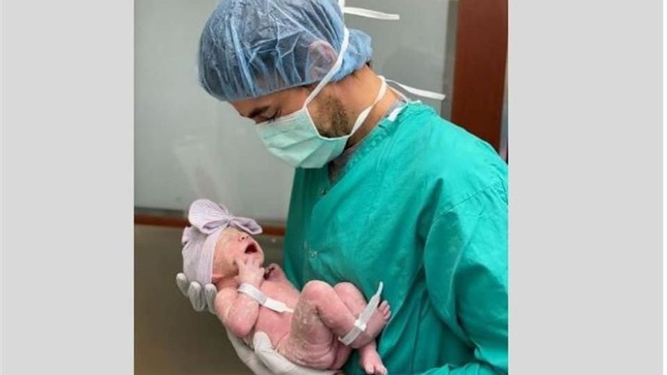 En la imagen se observa al intérprete sonriendo y sosteniendo a su hija recién nacida.