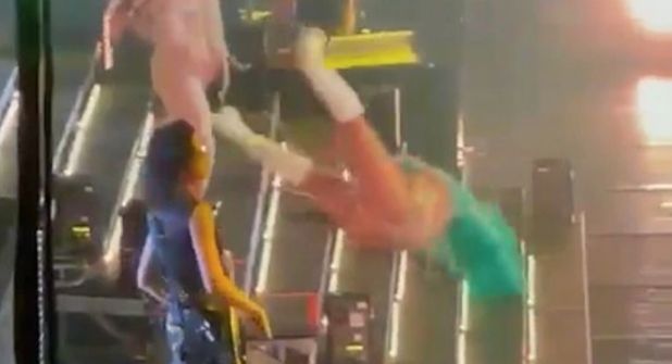 El accidente sobre el escenario se registró cuando uno de sus zapatos se atoró en las escaleras de la tarima mientras cantaba una de sus canciones. Lo que la hizo caer y rodar por las escaleras.
