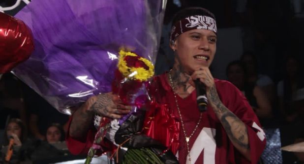 Con jersey rojo y jeans holgados, el rapero mexicano tuvo una exitosa noche en Nuevo Laredo en la que cantó todos sus éxitos, fue muy consentido y puso a cantar y a bailar al público.