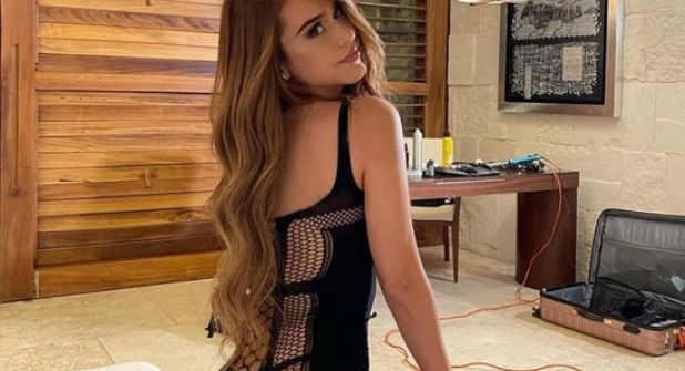 En las imágenes se aprecia cómo luce el mini conjunto de látex en color negro, además de unas medias de red. En cada imagen aparece muy sonriente, como normalmente suele hacerlo.