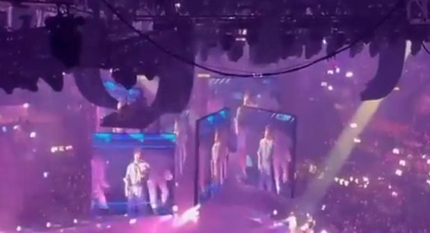 En el material se puede ver el momento en que los integrantes del grupo interpretan una coreografía cuando una de las pantallas gigantes cae encima de dos de ellos.