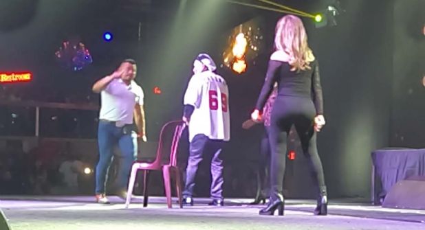 Brincos Dieras tomó el micrófono y comenzó a decirle al hombre que se tranquilizara, además de que le pidió a la mujer que lo mejor era que se fuera a su lugar para no ocasionar otro problema.