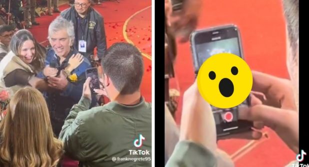 El novio, durante este momento, se preparó para tomar la fotografía del recuerdo, el cual seguramente su pareja subiría a redes sociales para presumir cómo fue besada por Alejandro Fernández, sin contar que dicho teléfono se abriría en la cámara frontal, perdiendo así el momento único e irrepetible.