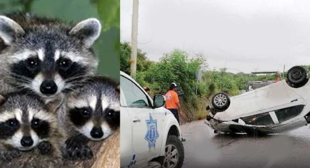 El conductor de un automóvil volcó su unidad por salvar a una manada de mapaches en el corredor urbano Luis Donaldo Colosio en Madero, Tamaulipas.