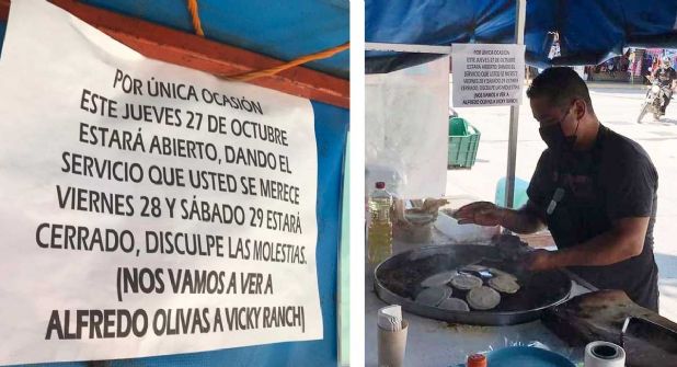 El hombre, quien tiene su puesto en la esquina de las calles Zaragoza y Guerrero, en el centro de la ciudad, colgó un anuncio escrito a mano donde previene a sus clientes que el viernes 28 y el sábado 29 el local de comida permanecerá cerrado para ir a la Feria a Ciudad Victoria y disfrutar del concierto del músico regional.