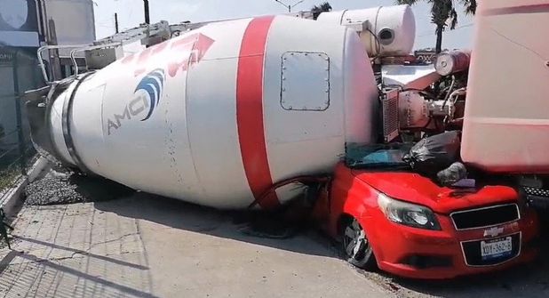 Una revolvedora de cemento aplastó totalmente a un auto compacto en la ciudad de Tampico, con todo y los tripulantes, que se encontraban adentro del pequeño vehículo.