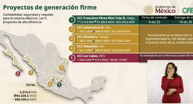 En la conferencia, la directora general de la CFE, Emilia Calleja Alor, dio a conocer que ya se desarrollan trabajos de ingeniería básica y de detalle para iniciar obras en las CCC de Altamira, Tamaulipas, en donde se invertirán 15 mil 38.5 mdp.