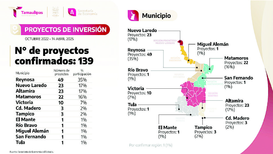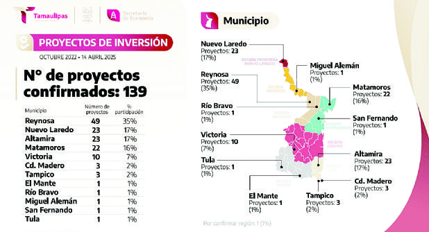 “Estas cifras reflejan la confianza que inversionistas nacionales y extranjeros depositan en Tamaulipas”, destacó Cantú Deándar. En total, Tamaulipas registra 139 proyectos de inversión distribuidos en 13 municipios. Matamoros reporta 22 proyectos (16%), mientras que Victoria contabiliza 10 (7%).