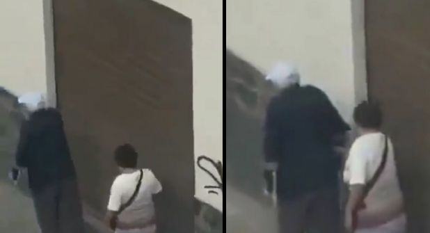Un video que quedó capturado por cámaras de seguridad y fue difundido en redes sociales muestra el momento en que una mujer se aproxima a un adulto mayor que va caminando por la banqueta con muletas.