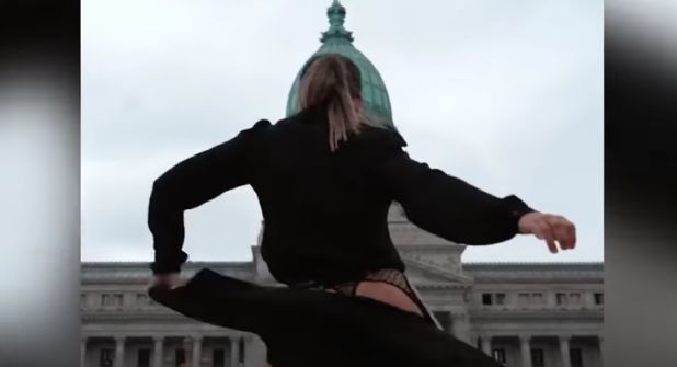 En el video compartido por ella misma la mujer bailó el tema en tanga, liguero, medias de red y tacones, con una blusa de manga larga, todo en color negro y al frente de dicho edificio que se encuentra en Buenos Aires.