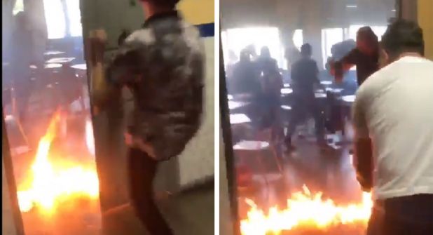 En un video compartido en Twitter, un alumno patea una de las puertas en donde iniciaba a crecer el fuego y un adulto sofocaba el fuego con un extintor.