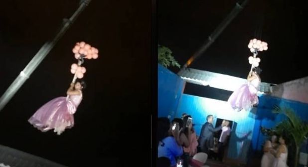 En lo que pareciera ser la parte más importante del evento, la festejada dejó a todos los invitados con la boca abierta, al entrar a la fiesta desde las alturas mientras sostenía unos globos, dando la apariencia de que estos sujetaban su vuelo, pero claramente fue apoyada un arnés que fue conectado a una grúa.