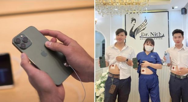 En redes sociales se viralizó una fotografía de la clínica del Dr. Nith Beauty en Laos, donde dos pacientes sostienen el modelo 14 del Iphone; a su vez, levantan su playera para descubrir una herida a la altura de su abdomen, sugiriendo haber extirpado su riñón a cambio de un aparato costoso como ese.