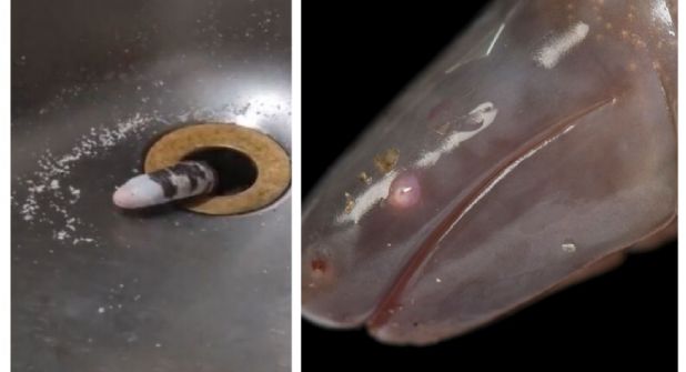 En un video que circula en redes sociales, una usuaria graba a un extraño animal asomándose por el hoyo del drenaje de su fregadero.