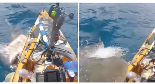 Afortunadamente para el hombre, el tiburón lanza la dentellada y solamente alcanza a herir a la embarcación tipo kayak, dejando al pescador la posibilidad de defenderse del ataque del escualo.