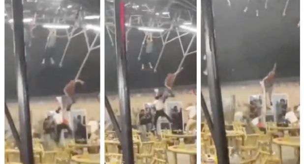 Uno de ellos incluso, se pierde de la imagen y se va junto con uno de los pilares del techo de metal, ante el asombro s las personas que buscan resguardarse.