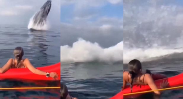 Y vaya que lo capto, la mujer que está en el agua, está vestida de rojo, y frente a ella, de pronto, del fondo del mar emerge una ballena, a lo que la joven grita con miedo, y a la par de ella, el enorme animal hace su característico canto y vuele a sumergirse.
