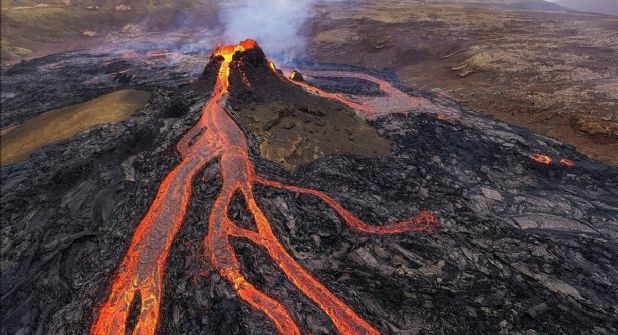 En una montaña de la península de Reykjanes en la base Litli-Hrútur, al sur de Islandia, se formaron tres fisuras, de las cuales empezó a brotar lava fundida, acompañada de una columna de gases.