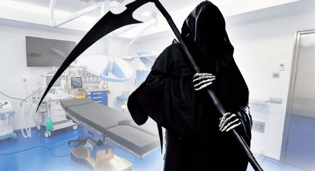 Al fondo del quirófano una gran silueta negra hace su aparición y por su característica forma es indiscutible, se trataba de la muerte.
