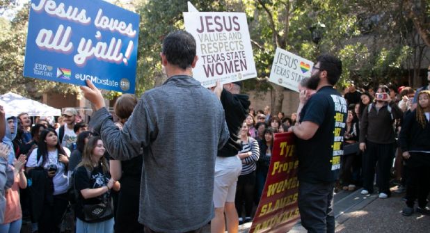 La protesta, organizada por miembros del grupo conocido como "The Official Street Preachers", provocó una inmediata contraprotesta por parte de cientos de estudiantes.