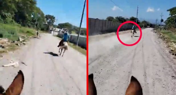 En las imágenes se observa al par de jinetes galopando a toda velocidad hasta un hombre con bicicleta, el cual caminaba a lado de la vereda. Tras acercarse al sospechoso, uno de ello lo laza, para después acusarlo de haberse robado el animal de su corral.