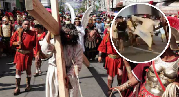 Una de las tantas representaciones de la Pasión de Cristo durante esta Semana Santa se volvió viral cuando un actor se salió de su papel para responder la agresión de uno de los asistentes.