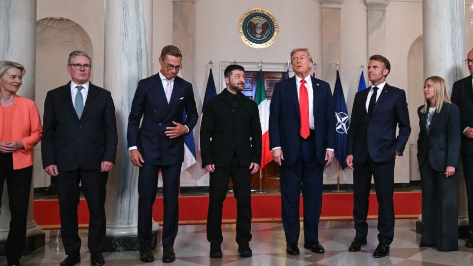 Durante la reunión, a la derecha de Trump, se encontraba el presidente francés, Emmanuel Macron y al lado de éste el primer ministro británico, Keir Starmer. A la izquierda de Trump estaba la primera ministra de Italia, Giorgia Meloni.