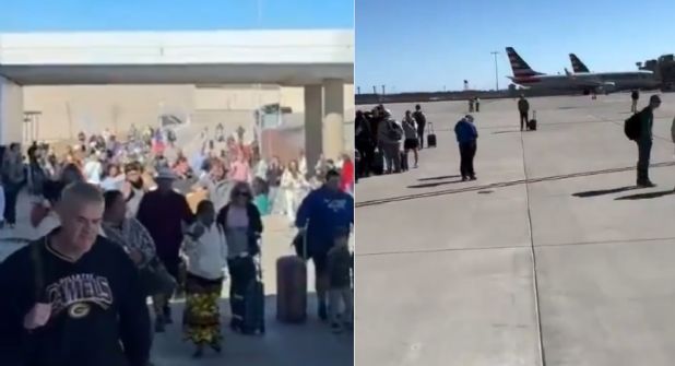 Imágenes compartidas en redes sociales muestran a grupos de personas saliendo del aeropuerto bajo la supervisión de agentes de seguridad, mientras se establecían perímetros para mantener alejados a civiles de las zonas donde se realizaban las inspecciones.