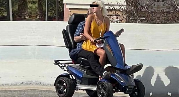 En una fotografía se puede ver como si el scooter estuviera bajo de una llanta, aunque también pudiera verse asi por el peso de las dos personas se desplazaban en el.