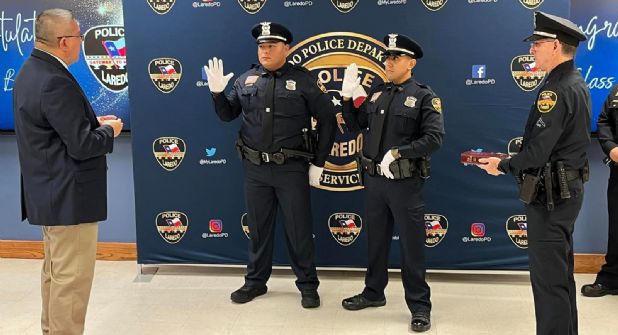 La Policía de Laredo suma más de 520 elementos, con José Solís y Pablo Camarillo que este jueves juraron como nuevos oficiales y se incorporaron al patrullaje citadino.