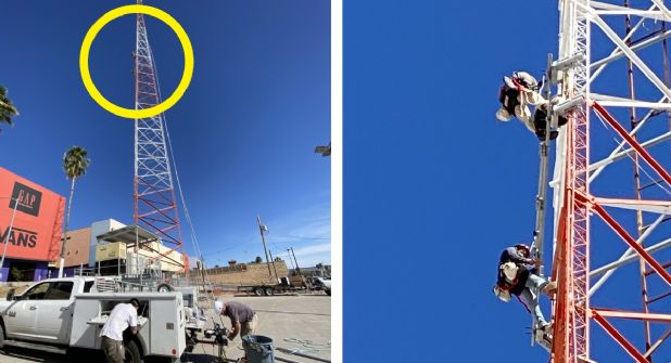 Este martes, a 150 pies de altura (45.72 metros) Mike y Barry realizaban trabajo para una empresa líder nacional en telefonía que contrató a su firma de mantenimiento, Todd dijo que por años nunca han tenido el menor incidente de peligro.
