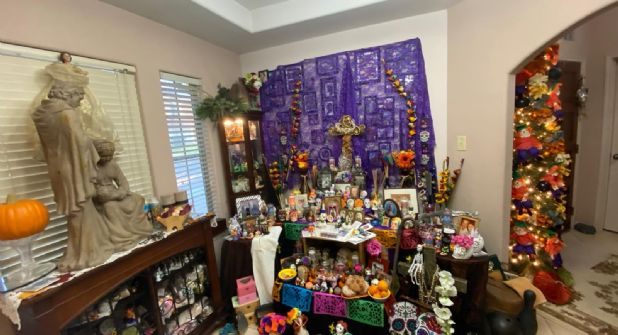 Jubilada del Colegio México de Nuevo Laredo, avecindada en Laredo, Texas, la maestra con profunda religiosidad instala su altar al que le dedica muchos días, a la vez que sus rezos y oraciones le acompañan al momento de ofrendar a los suyos en el más allá y de dialogar con ellos, lo suyo es todo un ritual.