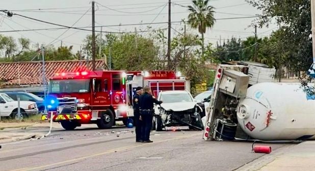 Un fuerte accidente fue el que se registró en la avenida Arkansas cuadra 26 norte entre O’kane y Price en Laredo Texas, luego que una "pipa" de gas butano terminara volcada tras chocar brutalmente contra una vagoneta conducida por una abuelita.
