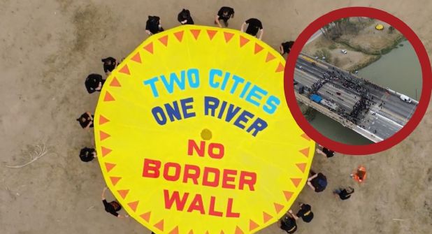 Los activistas desplegaron una pancarta circular con aire en la orilla del río Bravo y además, en una pequeña embarcación en pleno rio, colocaron una pancarta declarándose en contra de un muro en esta frontera.