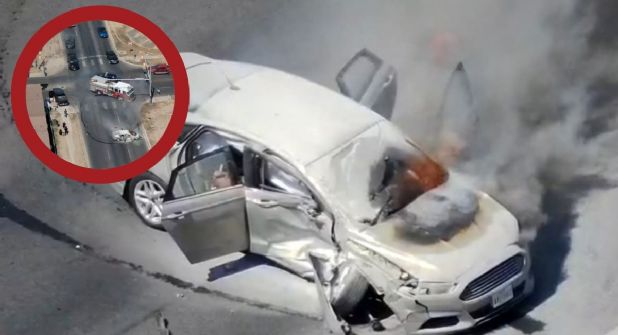 Momentos de tensión y pánico se vivieron en la esquina de Santa Úrsula y Chicago junto al hotel Siesta, esto tras un aparatoso choque que culminó con un vehículo envuelto en llamas, lo que provoco una fuerte movilización de los cuerpos de rescate.