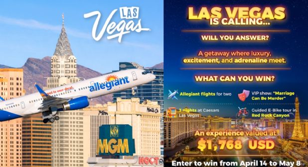 El premio incluye dos cupones de vuelo de Allegiant, cada uno por 250 dólares, así como tres noches de alojamiento en una propiedad de clase mundial de Caesars Las Vegas. A esto se suman dos accesos VIP al espectáculo de comedia Marriage Can Be Murder y un recorrido guiado en bicicleta eléctrica para dos personas en Red Rock Canyon.