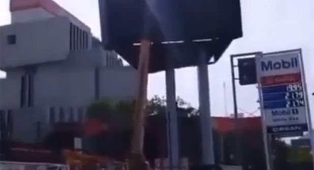 Una pantalla gigante quedó destrozada tras caer esta tarde desde varios metros de altura cuando era colocada por una grúa afuera de un local ubicado en la colonia San Francisco, de Nuevo León.
