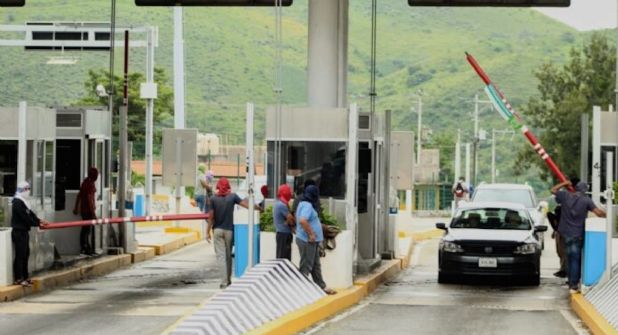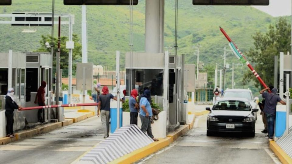 Jóvenes, mujeres y adultos encapuchados llegan a bordo de autobuses y vehículos a cualquier hora a las casetas, para tomar las garitas de peaje, levantar las plumas y hacerse cargo del cobro por pase de cada vehículo.