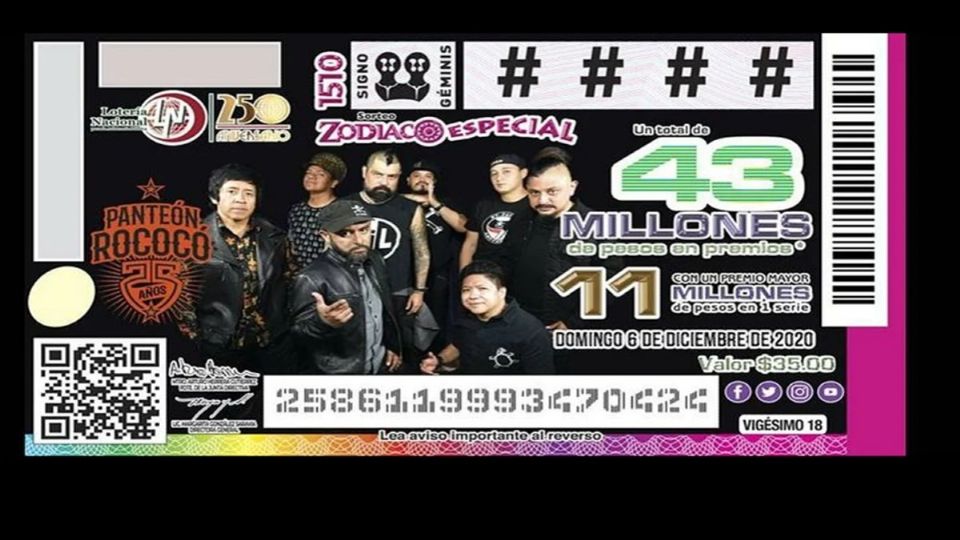 La Lotería Nacional dedicará el sorteo del Zodiaco Especial #1510 a la trayectoria musical y al 25 aniversario -el próximo 6 de diciembre- de Panteón Rococó, uno de los mayores representantes del rock mexicano, y con una carrera impecable.