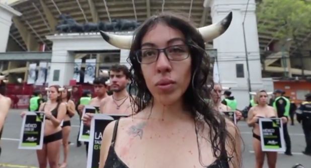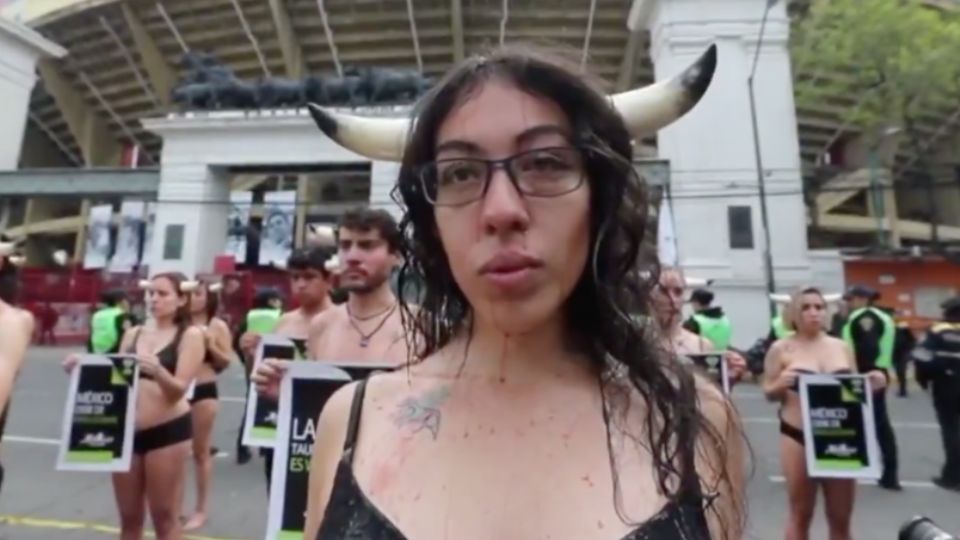 En ropa interior y al grito de “queremos un México sin tauromaquia”, los manifestantes portaron unos cuernos como los de los toros de lidia y se bañaron con sangre artificial para representar el sufrimiento de los animales en las corridas.