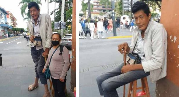 José espera en una esquina sentado en un banco a que le gente le obsequie una moneda. No puede permanecer mucho tiempo de pie ya que sus extremidades están tan deformadas que le imposibilita estar en una posición erguida.