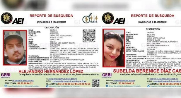 Se trata de Alejandro Hernández López, de 29 años, y su esposa, Subelda Berenice Díaz Castro, de 28. Según los primeros informes la última vez que se les tuvo contacto fue en en la cabecera municipal de Doctor Arroyo el pasado martes 11 de octubre.