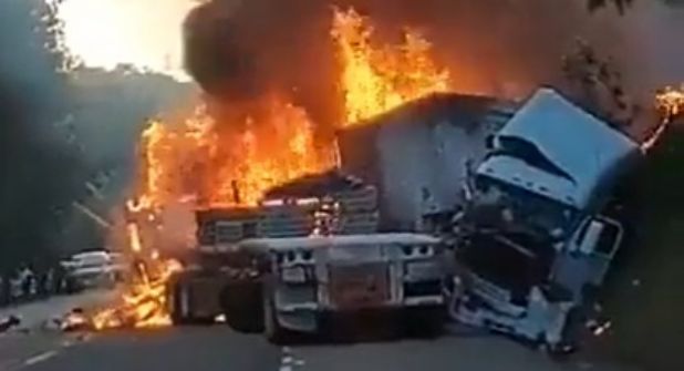 Las imágenes de un terrible choque de frente entre dos tráileres, del que se escuchan explosiones, trascendieron ayer en redes sociales, en donde se observan a las dos unidades completamente calcinadas.