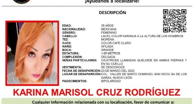 El otro reporte es de Karina Marisol Cruz Gutiérrez de 35 años de edad, a quien se le vio por última vez el 23 de marzo en la colonia Valles de Santo Domingo, en el municipio de San Nicolás de los Garza.