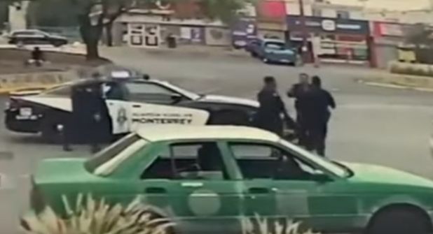 Una cámara de seguridad de un negocio captó el momento, en el que policías de la capital de Nuevo León viajan a bordo de un auto patrulla y de pronto se estaciona afuera de una tienda de autoservicio en la rotonda de Lago Erie y Lago Zurich, colonia Lagos del Bosque.